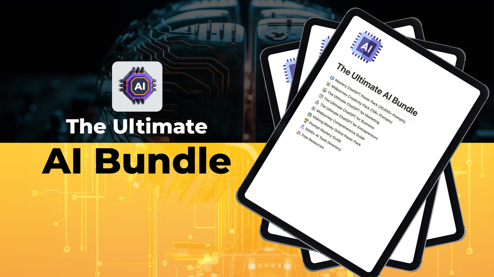 Ready to unlock the full power of AI? The Ultimate AI Bundle is the ultimate toolkit to help you master AI for business, creativity, and growth. From ChatGPT mastery to Midjourney prompts, this bundle has everything you need to scale up your skills and success.